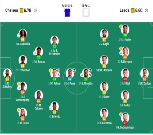 切尔西首发:1-桑切斯、27-古斯托、34-乔什·阿昌庞(79’29-福法纳)、23-查洛巴、3-库库雷利亚(46’21-哈托)、25-凯塞多、17-桑托斯(79’9-德拉普)、10-帕尔默、8-恩佐、41-埃斯特旺(64’7-内托)、20-若昂·佩德罗。