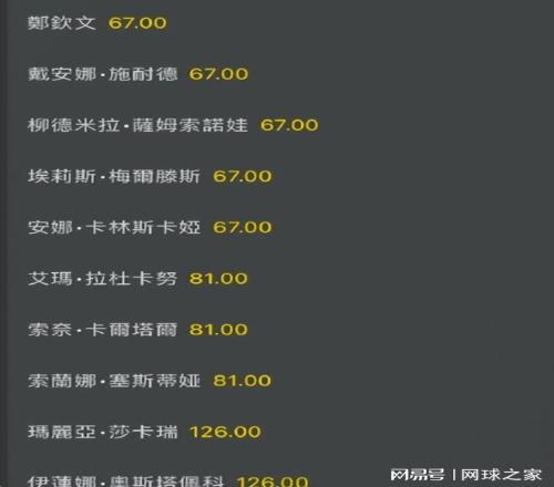 相关于莱巴金娜以3.6排在首位,斯瓦泰克以4排在第二位,高芙以7排在第三位,以及阿尼西莫娃以8排在第四位,郑钦文直接以67排在倒数第三。
