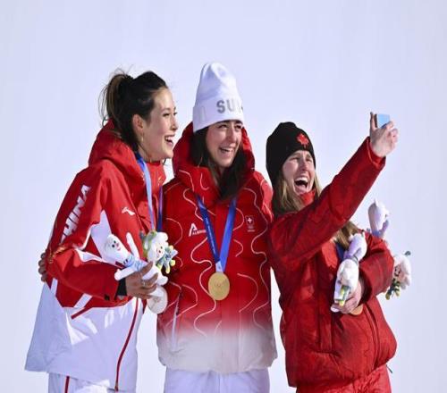 2月9日的自由式滑雪女子坡面妨碍技巧决赛赛后,亚军中国选手谷爱凌(左)和冠军瑞士选手玛蒂尔德·格雷莫德(中)、第三名加拿大选手奥尔德姆在领奖台上合影。新华社记者 张宏祥 摄