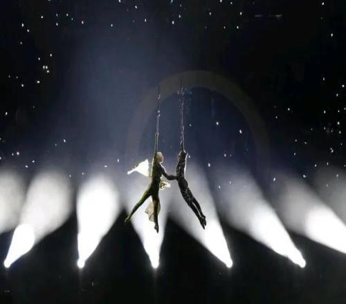 舞蹈《城市与高山》,别离标志米兰和科尔蒂纳的舞者站在圆环中心慢慢升起,终究在高空中相拥,标志人与天然的调和共生。